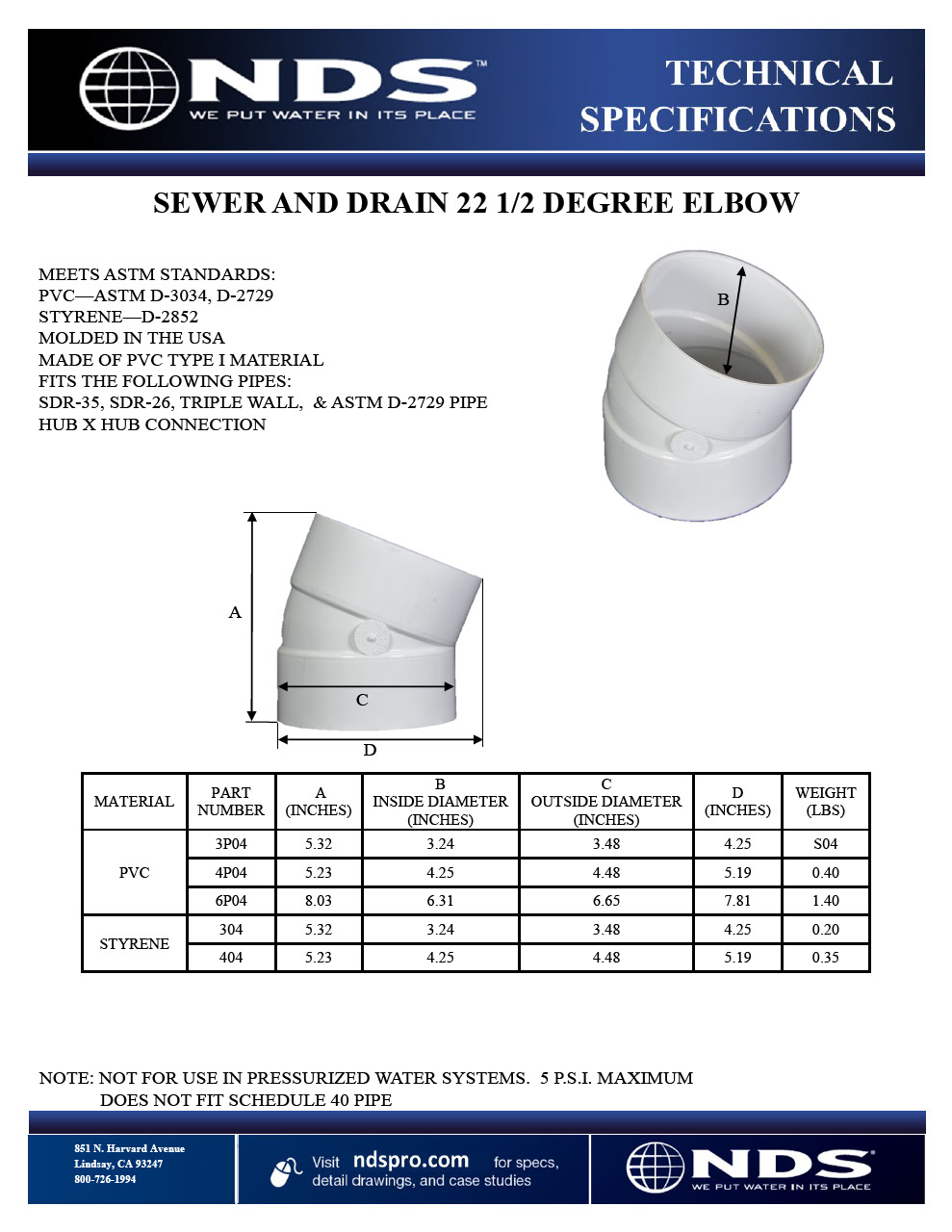 • Adds a 22.5° turn from 3 in. Sewer & Drain (S&D) pipe to 3 in. S&D pipe in non-pressurized drainage and sewer piping systems